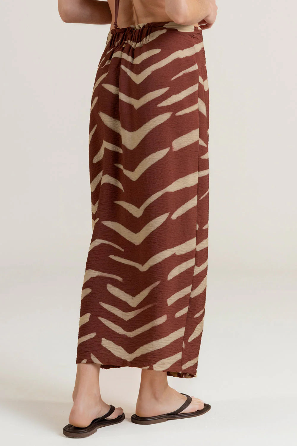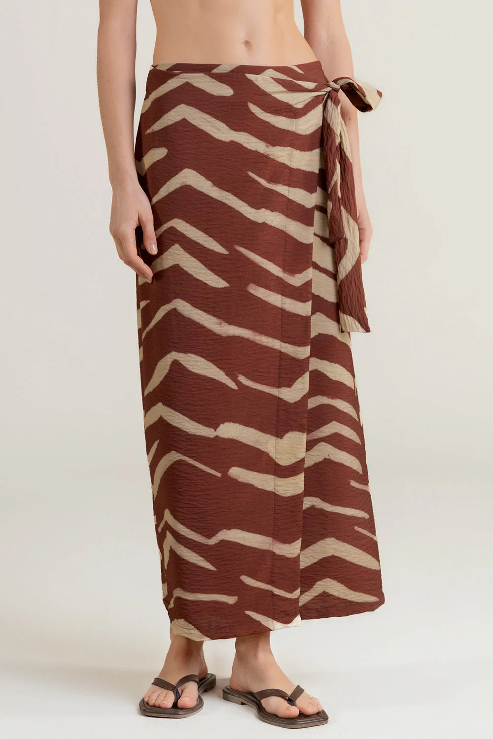 Falda pareo con estampado terracota y beige, cruzado en frente con botón interno y tiras laterales para un mejor ajuste y un fit personalizado, largo midi, detalle moneda con la "t" grabada en baño de oro, característica de nuestra marca para evitar oxidación.