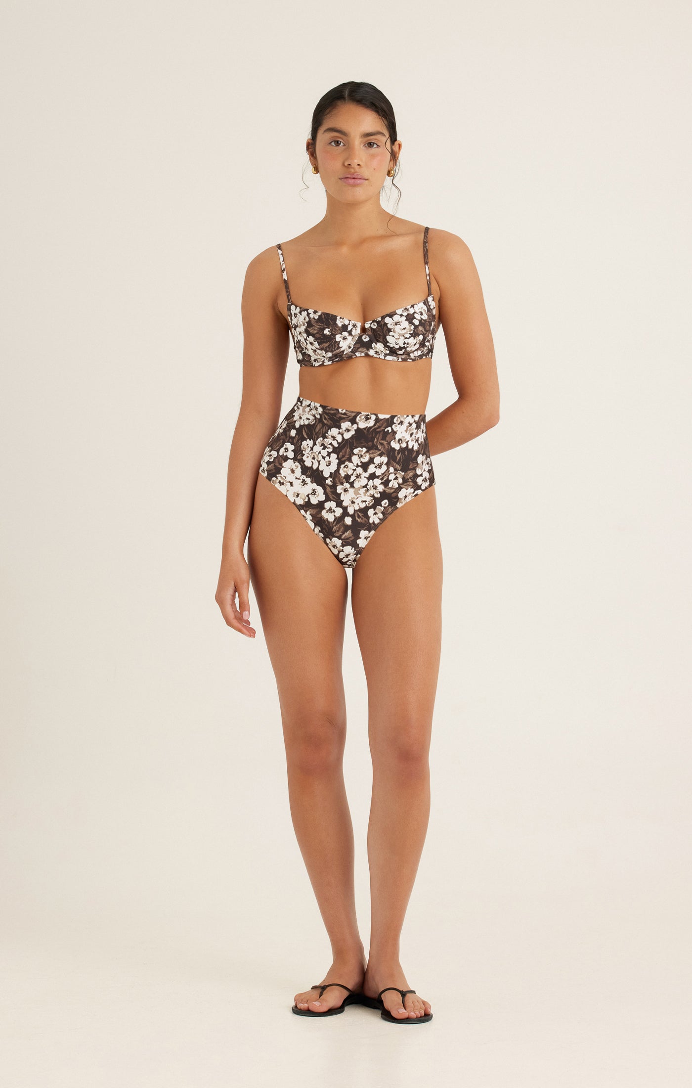 Bikini de dos piezas con estampado floral en tonos chocolate y marfil que combina elegancia y feminidad. El top estilo balconette ofrece soporte suave y realce natural, mientras que los tirantes delgados mantienen un look delicado y sofisticado. La parte inferior de tiro alto estiliza la cintura y alarga visualmente las piernas, creando una silueta favorecedora y equilibrada. Confeccionado en tela suave, elástica y de alta calidad que se adapta cómodamente al cuerpo. Ideal como bikini floral elegante para playa, vacaciones o resort. Un conjunto atemporal que mezcla romanticismo y sofisticación.